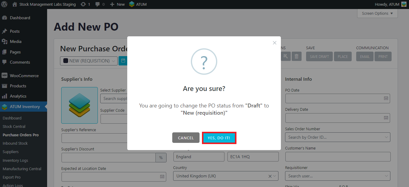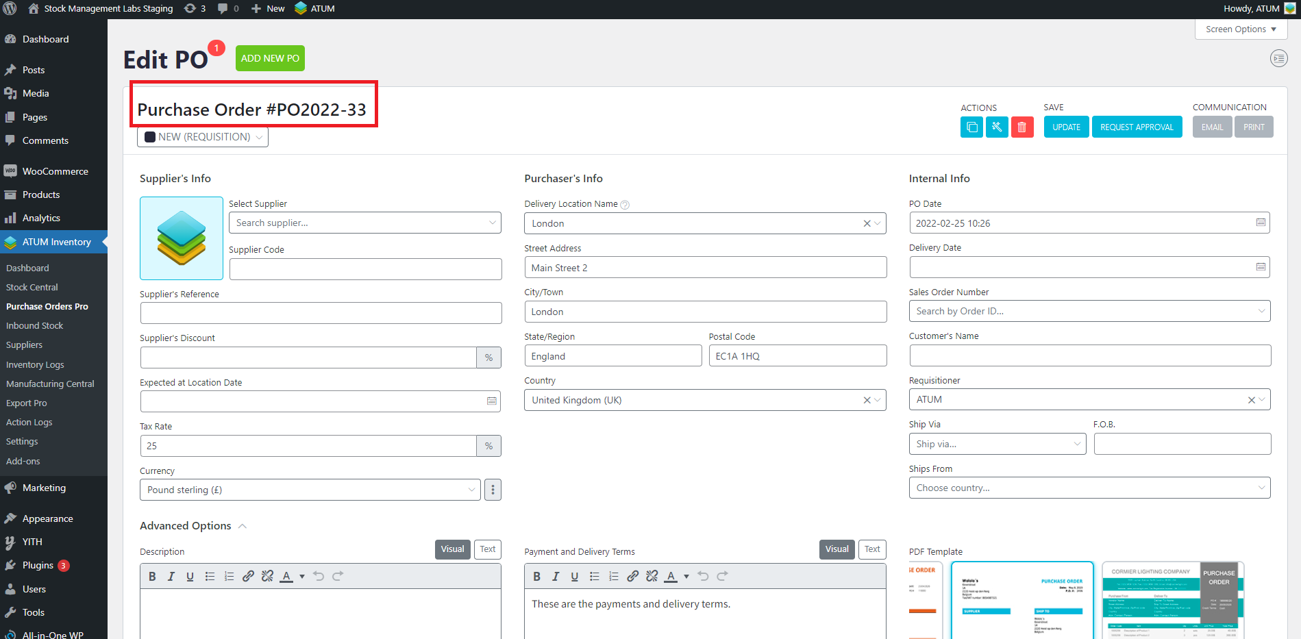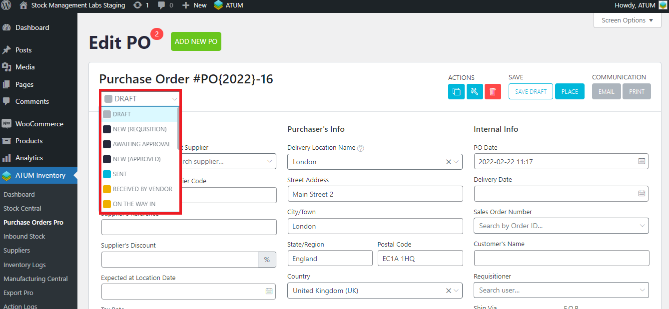 In the dropdown, you will see all the locations created in ATUM Locations. If you select one of them, its info it will be set by default in the Purchase Orders (however, you can modify this information manually):
