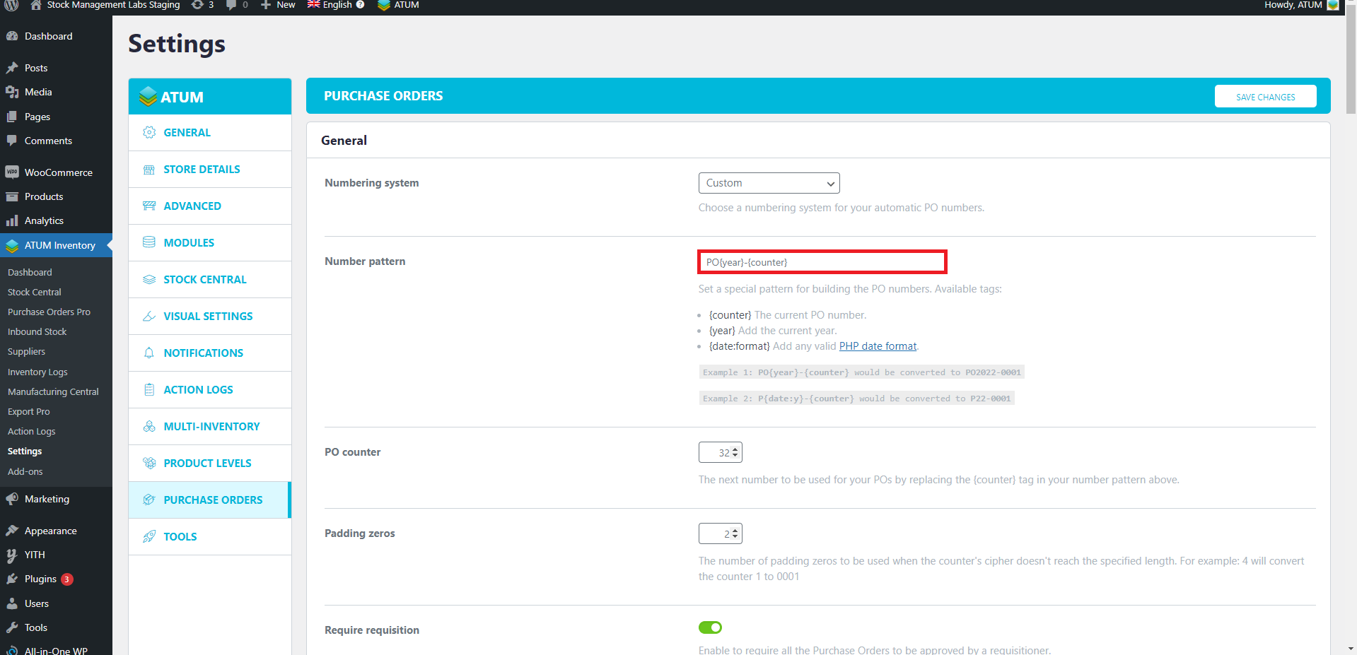 - Number pattern: Set a special pattern for building the PO numbers. Available tags: